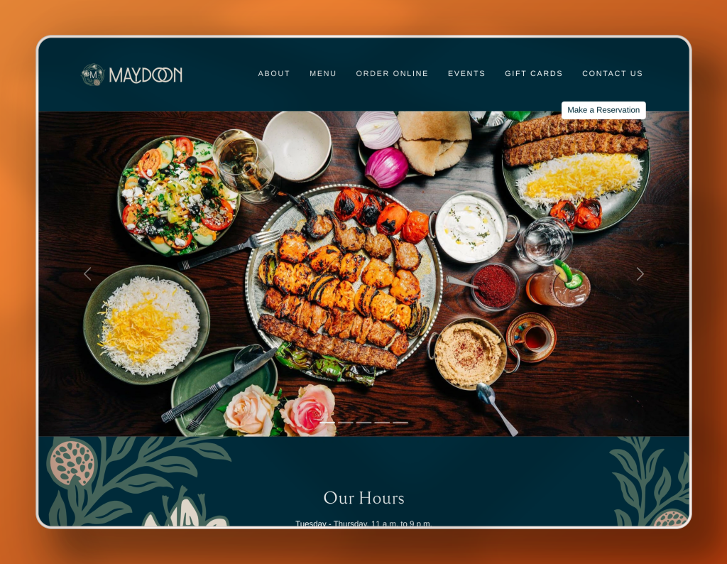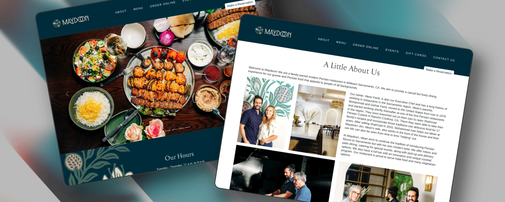 Maydoon’s branding guide provided a solid foundation for our design and development process. However, the restaurant’s online presence was lacking, and they needed a website that would accurately reflect their brand and effectively serve their clientele. The website needed to be functional, easy to navigate, and provide a seamless user experience across various devices.